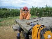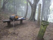 途中休憩 11時30分 休憩したい、座りたいと思ったとき、グットタイミングでベンチがあった。全身汗ビッショリになっていて、ここで上着を脱いでしばし休憩。 下山する人に会った。「この時間に登る人はあまりいませんよ」と言われた。地元の人らしい。 |