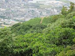 小文字山を見下ろす 15時48分 何度かアップダウンを繰り返し、ようやく小文字山の山頂が見えてきた。 |