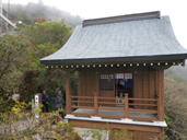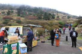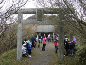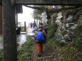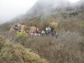 山頂から普賢神社の小広場を見下ろす 下を見ると、たくさんの人が昼食中。 私たちが合流すると、より混雑しそうな気がしたが、私達と入れ替えで団体さんは下山した。ラッキー。 昼食中も霧の中 |