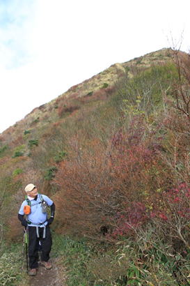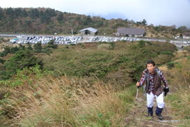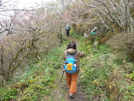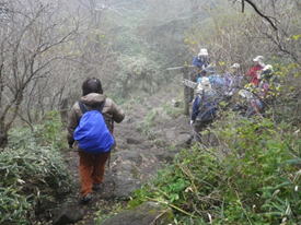 一気に下る 12時38分 ここから約100mをグングン下って鞍部の紅葉茶屋を目指す。 下るということは、最終目標の普賢岳にはその分また上るということで、もったいなく感じてしょうがない。 痛み出した膝をストックでカバーしながら、なるべくソフトに歩くよう心掛ける。 気が付いたらしんがりを務めていた(笑) |