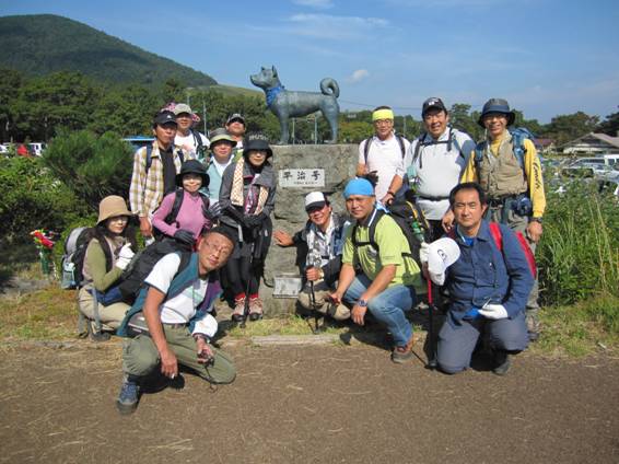登山開始前に参加者全員で記念撮影。(長者原駐車場横の平治号銅像の前にて)