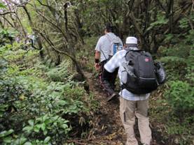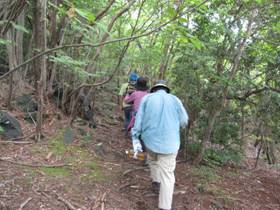 樹林の中を進む 12時40分 足元は石がゴロゴロ、黒土は滑る。最初は道もわかり難く、赤テープを確認しながら進む。 |