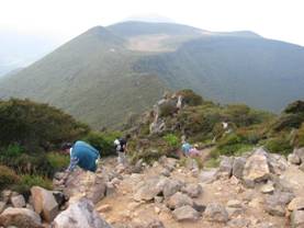 9、すがもり越え 9時07分 1505m 今歩いてきた道。遠くに昨日登頂した大船山が見える。すがもりの鐘の下でしばし休憩。