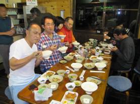夕食 18時39分 待ってました、全員大盛りのご飯。こんなに美味しい夕食は久しぶりだ。夕食全8品 最高。 |