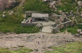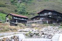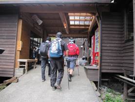 早朝の坊ヶつる 7時33分 朝早くから登山者が山荘を出発して行きます。