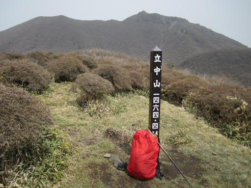 12、立中山山頂 13時11分 1464m 法華院温泉山荘から38分で登頂。 風が強い |