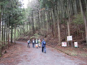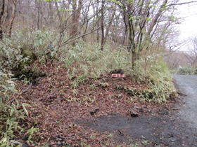 5、大船林道に飛び出す 10時20分 看板の横の道から飛び出て右へ進む。 |