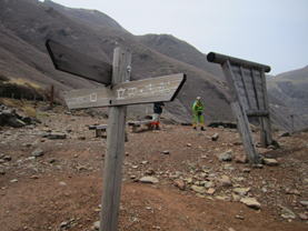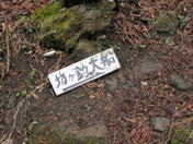 暮雨の滝への分岐 15時50分 ここから「暮雨の滝」へ下る。黒土がズルズル滑り、とても危ない急坂になっていた。 足下の標識 |