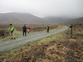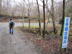 6、広場に出る 10時41分 この広場には法華院温泉山荘の自動車が置いてある。8号離合場所の立看板がある。 小雨が続く |