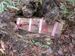 暮雨の滝コース分岐 15時24分 ここから「暮雨の滝」を経由して登山口に向かう。 足下注意 |