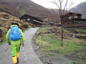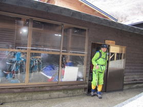 9、管理休憩舎 11時16分 ここで大船山に挑戦する前の腹ごしらえをして、レインウェアをしっかりと着込んだ。 |