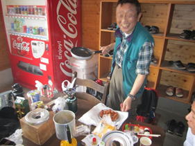 シェフK庭君の腕の見せ所 12時09分 さすが料理人いろんな調理道具を持参している。 |