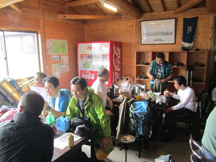 10、法華院温泉山荘の休憩所内にて宴会が始まった。 12時08分