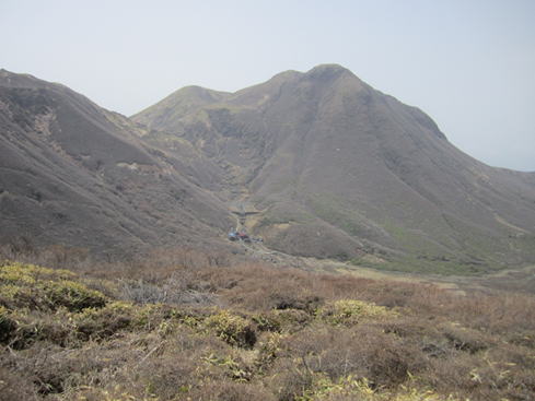 白口岳と鉾立峠 13時06分 立中山の中腹あたりから登って来た道を見下ろすと、直下に鉾立峠、正面に白口岳の全貌が見える。 山頂まであと少し |