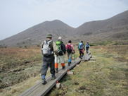 下山開始 14時49分 記念撮影も終わり、法華院温泉山荘に別れを告げ、坊ヶツルへ向かった。平治岳も見える。 木道を歩く |