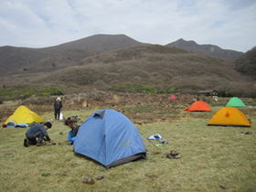 坊ヶツルキャンプ場 15時00分 お昼から到着した登山客がテントを設営している。 |