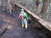 暮雨の滝分岐を出発 16時10分 なだらかな道が続くが、途中から急坂を下ることになる。午前中の雨でぬかるんでいる。 落ち着いて |