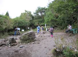 登山開始 10時10分 登山口で集合写真を撮って登山開始。 「由布岳東峰にて全員で記念撮影!」を合言葉に登山を開始する。 |