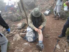 応急処置 13時03分 どうしようかとオタオタしていると、親切な若い青年が、エアーサロンパスとテーピングを差し出してくれました。本当に助かりました。 東峰は断念です。まさかのアクシデントで、東峰での全員の記念撮影は出来なくなりました。 仕方ありませんね。止むを得ず一人をマタエに残して東峰へ向かいました。(涙) |