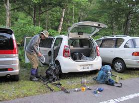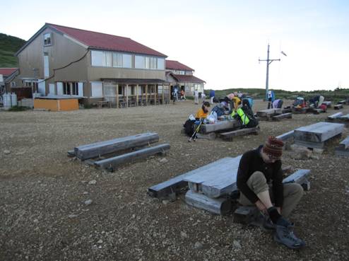 日が暮れる前に夕食タイム。 テント広場奥のベンチを使って夕食をとる。 実は駐車場に到着時、先着の登山者が、「ここに到着する少し前に熊を見た」と教えてくれた。驚いて、私たちの次に駐車場に着いた登山者にこのことを伝えると・・・「私もこの前、子熊を見ました。」 ・・・。 そんなに頻繁に熊を見るということは・・・ちょっと ヤバイかも? 夕食後早々車中に退避した。(笑) |