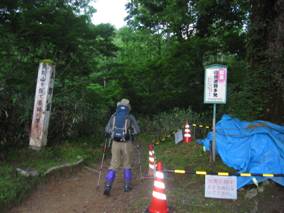 17、登山口へ到着 13時57分 愛知大生の慰霊碑に頭を下げ登山口へ。 やっと折立登山口に下りて来た。少々お疲れモード。日差しは強いし気温も高く、汗びっしょり。