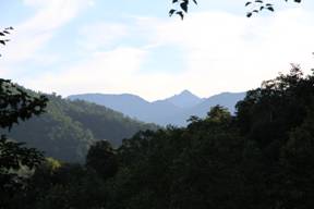 樹林帯の中を進む 5時38分 登山口を出発して10分程度で左手遠くに、どこかで見たような山が目に飛び込んできた。あれは・・・ひょっとしてあの有名な「剣岳」? まだ全然登っていないのに・・・。 今日はお天気が良く、空気も澄んでいる。 期待が膨らんで、足が軽くなった。 |