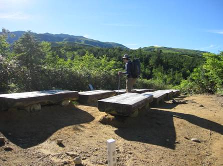 整備された登山道を下る 12時04分 ベンチで休憩。ニッコウキスゲが美しい。