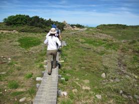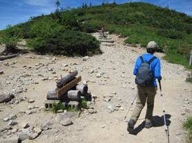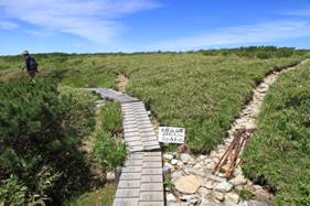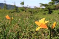 整備された登山道 7時33分 三角点から少し歩くと、展望が開けた登山道となった。ニッコウキスゲの「黄色」が目を引く。