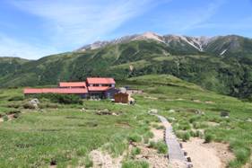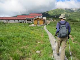 | 二日目(7月19日) 4時10分 起床 前夜から登山の支度を整えていたので、あまり焦ることはない。 5時の朝食まで小屋前の広場で写真を撮りながらボーっと待つ。 |