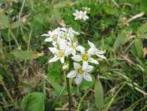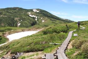 なだらかな木道が続く 11時07分 コバイケイソウがあちこちに咲いている。 北ノ俣方面に向かう登山者はあまりいない。 登山道付近の花の撮影をしながらのんびり歩いた。 歩き易い木道が整備され、苦もなくずっと歩く。 徐々に雪渓が近づいてくる。北ノ俣岳の山頂はまだ見えない。 |
