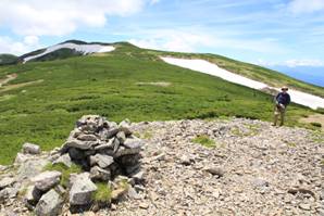 2576mピーク 12時11分 太郎平小屋から約1時間10分で、ケルンのある名前の付いてない2576mピークに到着。 ここまで来ると北ノ俣岳もすぐそこに見える。 時折吹く気持ちいい風にあたり、雄大な眺めを堪能しながら歩を進める。 足元には綺麗な花があちこちに咲いている。 とにかく雪渓が美しい。 |