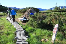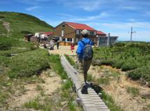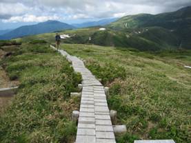 北ノ俣岳を下山開始 13時15分 少し下ると木道で景色を楽しみながら休憩している登山者を見かけた。