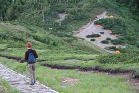 テント場が見えてくる。 5時48分 木道を進んでいくと一旦下りになる。