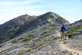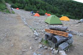 9、薬師峠 5時53分 色とりどりのテントが10張り程あった。このテント場は太郎小屋の管轄で、予約しておくと、小屋のスタッフが冷えたビールをここまで運んでくれるそうだ。 ここでテント泊をする人は私たちみたいな小屋宿泊者と違って本格的登山者。テントや食糧を担いで登ってくるので尊敬に値します。 |