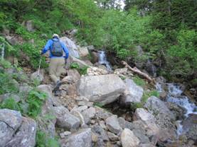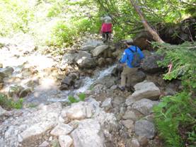 岩がゴロゴロした涸れ沢の急坂 5時59分 薬師峠を過ぎるとここから本格的な上りとなる。たぶんここは雨が降ると川のようになるのだろうと・・・。ところどころで水が流れている。