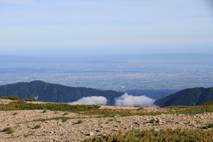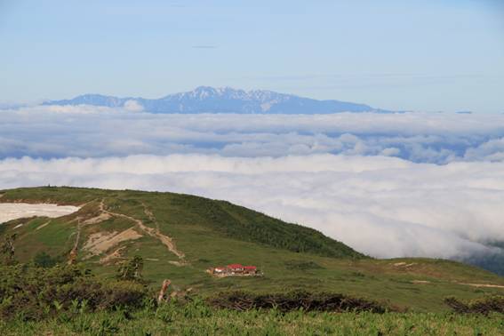 素晴しい眺望 (太郎平小屋の背景には雲海に浮かぶ加賀の白山が見える) 6時23分