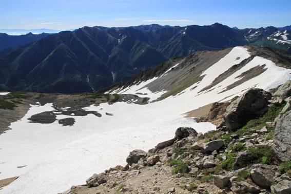 雪渓が残る北ノ俣岳の斜面 12時31分