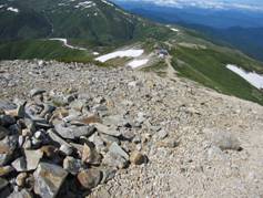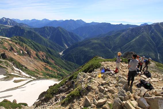 昨日登った北ノ俣岳(左の雪渓のある山)と宿泊した太郎平小屋が小さく見える