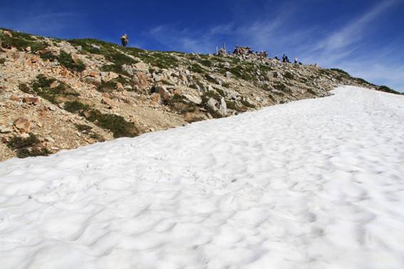 雪渓の氷で涼をとる。 13時30分 足元の雪渓から雪(ザラザラとした氷)を手にとり、首筋にあてる。なんと気持ちいいことか。