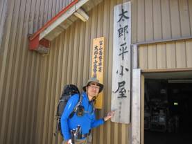 太郎平小屋の看板に別れを告げる この看板は山岳文学「山と渓谷」の著者でも知られる登山家・田部重治の直筆である。