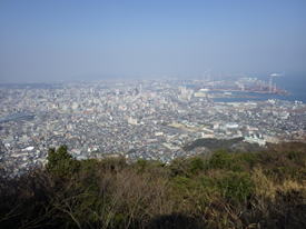 小文字山(こもんじやま)山頂ベンチから北九州市街地を望む。左に見える山は砲台山。