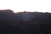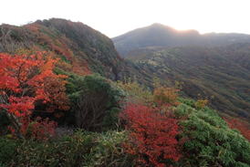 紅葉がまだ美しい沓掛山の稜線。 星生山方面から太陽が上がろうとしている。 |