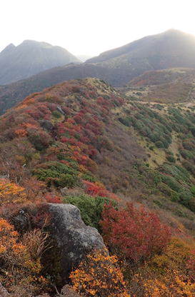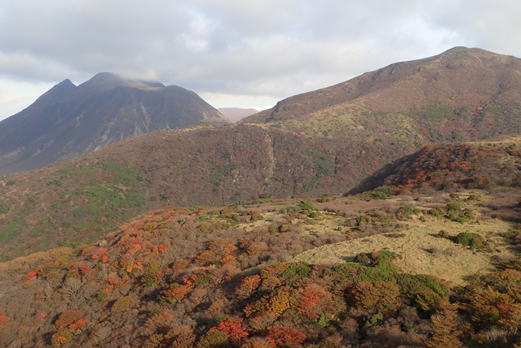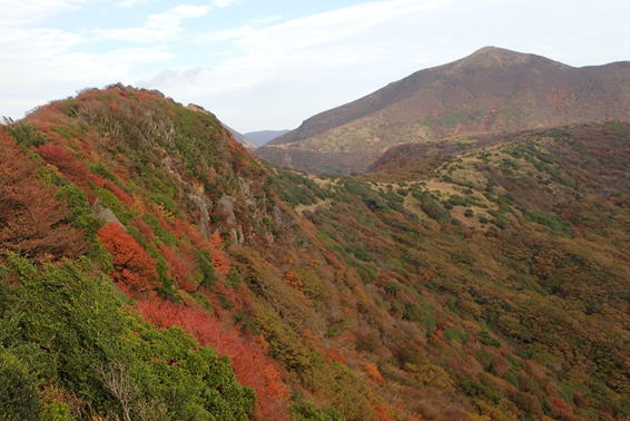 牧ノ戸方面の紅葉 14時38分 右端は涌蓋山
