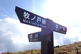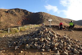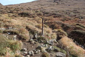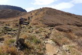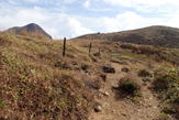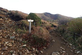 分岐で小休憩 10時49分 この分岐は、今歩いてきた道を含めて4つのルートに分かれている。 1、中岳 2、久住山 しかし、坊ヶツルへの道は以前から土石流の為、通行止めとなっている。(18年前は家族で法華院温泉山荘まで下ったことがある) |