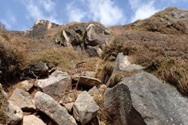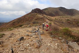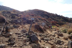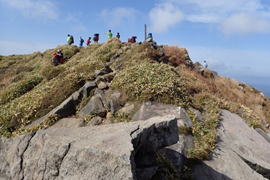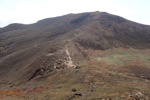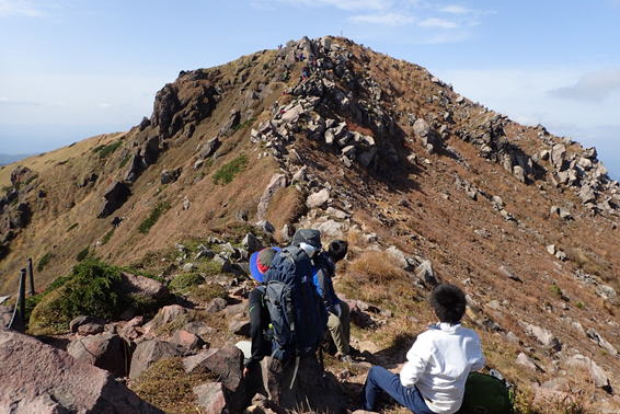 | 眼前に星生山の山頂 13時10分 若者が少し待機して岩場のルートを探っている 先行の登山者は岩場に苦戦しているようで、なかなか前に進まない |