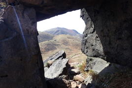 星生崎から避難小屋を覗き込む 12時42分 久住山にたくさんの登山者が登頂している |