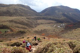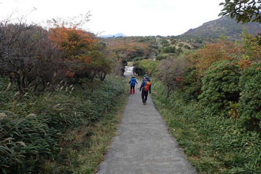 学生グループが楽しそうに歩いていく 12時47分 左奥のピークが星生山 |