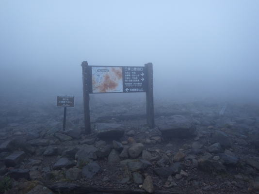 すがもり越えの休憩舎のベンチに座り、作戦会議! 「チャレンジ21」も1座目で断念なのか? 少しためらう気持ちも出たが安全第一を忘れず、「とにかく行けるところまで行ってみよう!」と気を取り直して、レインウェア、ザックカバー等の完全装備で三俣山を目指すことにした。スマホによる天気予報は午後から回復するらしいが、そのようには思えない。霧雨は完全に雨に変わり、霧は更に濃く、そして風も吹いてきた。 「さあ、三俣山に登ろう!」(本音はかなり不安) 無理はしないことを肝に銘じて、右側のなだらかなスロープの登山道を進むことにした。