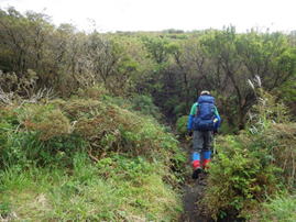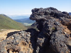 37、西千里ヶ浜 13時42分 星生山山頂から一気に下って来た。これから肥前ヶ城の登山道入り口を探すことになるが、西千里ヶ浜には白いロープが張られて肥前ヶ城方面に入りづらくなっている。「立入り禁止」なのか?はっきりしない。それで、少し戻ることになるが、西千里ヶ浜を久住山方面に歩きながら様子を伺った。ロープは続き星生崎手前までウロウロと歩いて行った。 |