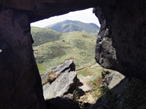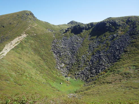 天狗ヶ城(左)と空池(からいけ) 10時41分 空池の斜面は岩がゴロゴロ